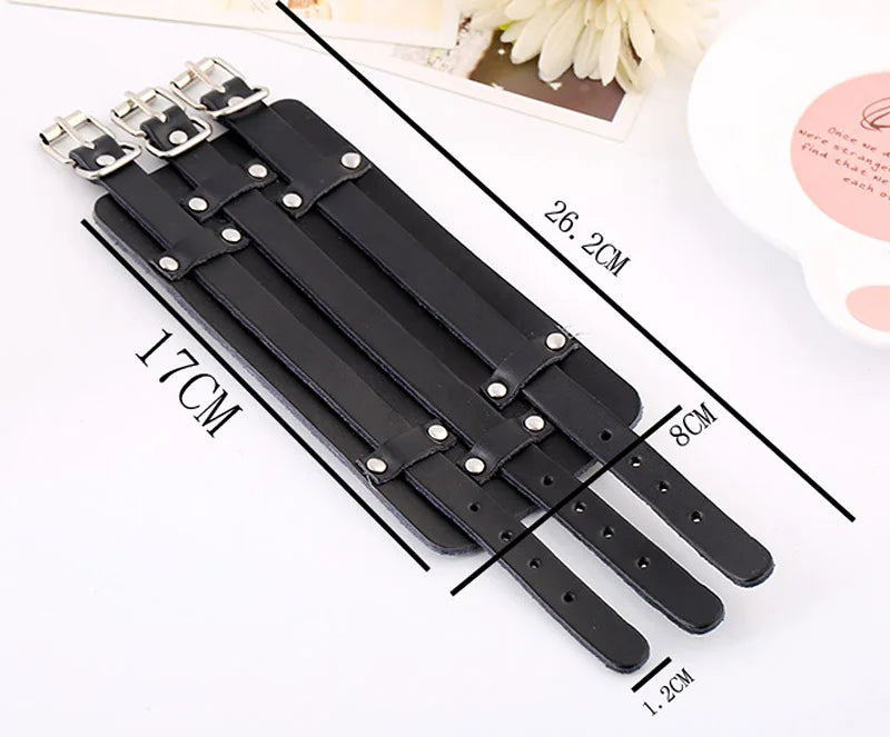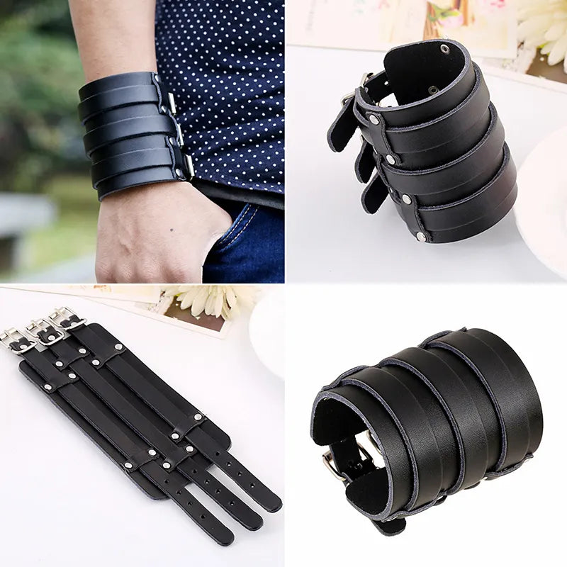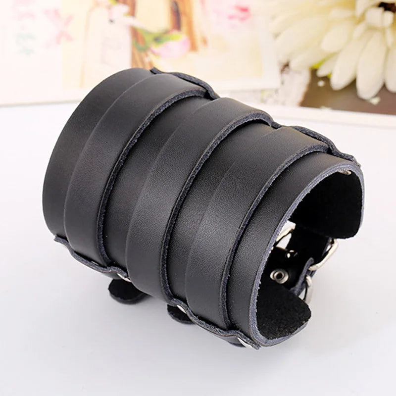 Genuine Leather Wide Cuff Bangle Vintage Three Layers Wide Black