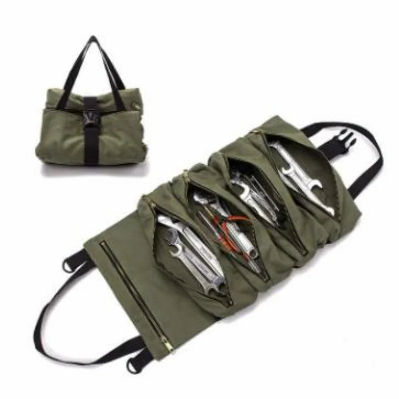 You can quicklyroll it up and store the items you need.The top handle is easy to carry around or hang behind the car seat. With 5 deep zipper pockets, you can sort various tools in an orderly manner.