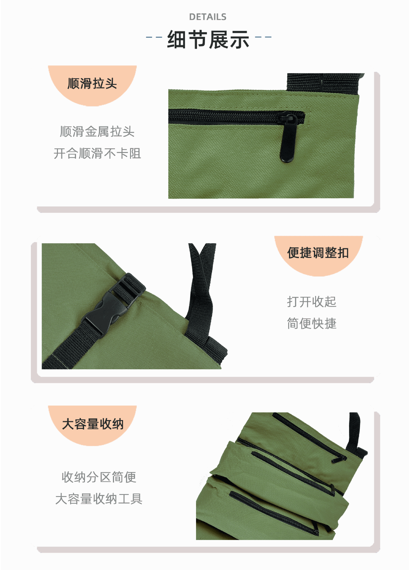 5 pockets to carry a range of tools, such as pliers, screwdrivers, chisels, level, wrench, scissors, and so on.